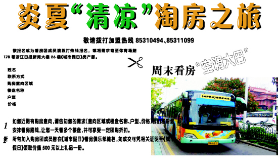 欲报名成为看房团成员请拨打热线报名,或将需求寄至体育场路178号浙江日报新闻大楼26楼《城市假日》房产部。