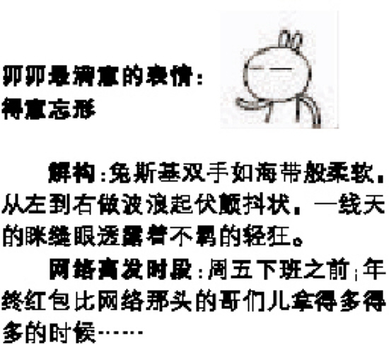 解构:兔斯基双手如海带般柔软,从左到右做波浪起伏颤抖状,一线天的眯缝眼透露着不羁的轻狂。