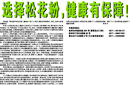 万三保健公司马尾松花粉作为我国首个松花粉现代有机原料通过了国家有关部门的严格认证,相关指标均符合现代有机食品规范要求。松花粉是一种纯天然、无污染、营养均衡的药食两用养生珍品,取材于马尾松,属中国独有的可再生资源。为了科学合理地开发利用这一民族资源,马尾松花粉权威专家,万三保健公司技术总监朱德俊教授带领科研人员运用有序采集、控制水分、压强和后熟等一系列科学方法,既提高了原料品质,又保护了生态平衡。万三马尾松花粉以优良的品质,合理的价格,博得了广大消费者的厚爱!拥有了万三松花粉的您,就拥有了健康的保障! 张丽/文