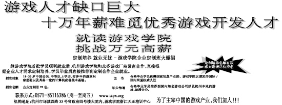 继游戏学院首批学员顺利就业后,杭州游戏学院和众多游戏厂商紧密合作,直接根据企业人才需求定制培养,学员毕业后直接推荐到定制合作企业就业。