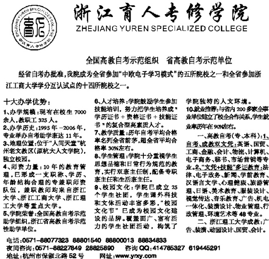 5、学院荣誉:全国高教自考示范助学组织,浙江省高教自考示范性助学单位。