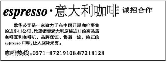 欧华公司是一家致力于在中国开展咖啡事业的进出口公司,代理销售意大利原装进口的高品质咖啡豆和咖啡机,品牌保证、售后一流,纯正的espresso口味,让人回味无穷.。
