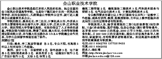 教师:会计3名 市场营销 2名 涉外旅游 3名 电子商务3名 国际贸易商务2名 商务英语 2名 动漫设计制作2名 广告设计制作3名 文秘 3名 体育2名