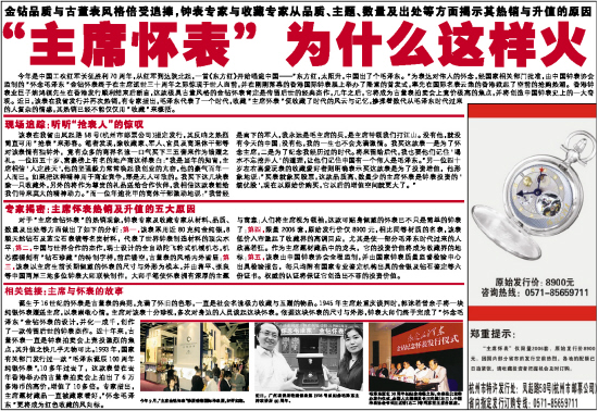 今年是中国工农红军长征胜利70周年,从红军到达陕北起,一首《东方红》开始唱遍中国——"东方红,太阳升,中国出了个毛泽东。"为表达对伟人的怀念,经国家相关部门批准,由中国钟表协会监制的"怀念毛泽东"金钻怀表终于在主席逝世三十周年之际惊现于世人面前,并在刚刚落幕的香港国际钟表展上举办了隆重的首发式,率先在国际名表云集的香港掀起了空前的抢购热潮。香港钟表业巨子姚鸿祺先生在香港发行顺利结束后断言,这款极具古董风格的金钻怀表肯定是传留后世的经典杰作,几年之后,它将成为古董表拍卖会上竟价极高的焦点,并将创造中国钟表史上的一大奇观。近日,该表在我省发行并再次热销,有专家指出,毛泽东代表了一个时代,收藏"主席怀表"便收藏了时代的风云与记忆,掺揉着数代从毛泽东时代过来的人复杂的情感,其热销已经不能仅仅用"收藏"来概括。