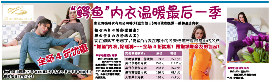 浙江鳄鱼制衣有限公司特为《城市假日》周刊读者提供一批特惠价内衣
