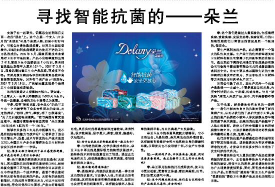 于是,倡导“智能抗菌、安全放心”的朵兰卫生巾一上市就受到了众多女性朋友的青睐,用过的都说,“舒服,透气、柔软,样子也很漂亮”,“用了之后感觉特别清爽。”在与美国专家交流过程中,美国专家琼森特甚至笑称“朵兰真是100年技术飞跃的另一个100年。”