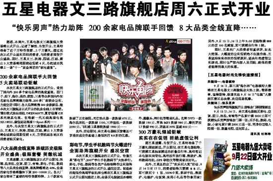 9月15日、16日,来五星电器购买彩电、空调、厨卫、冰洗、音响等产品累计满3000元即可获赠快乐男声演唱会门票一张;买手机、数码、电脑、小家电累计满2000元送一张,凭身份证每人限领一张,数量有限,送完即止。