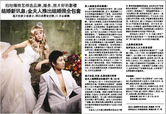 每年到了拍结婚照的好季节,新人总是会为如何选择影楼犯愁。近日,笔者就新人心目中所期望的影楼进行了调查,近来在民政局登记结婚的新人说出了他们的一些想法:“拍结婚照么,当然是想找大品牌,个么有保障。”唐先生笑着说,但是有很多新娘更在意服务品质,这里另外一对新人补充:“不光是品牌要大,还有服务要好,更重要的是照片要拍得时尚,大气。”、“品牌影楼的底片都不全送的,这个我们自己的照片不管好的不好的都想要留的。”、“影楼里在拍照过程当中还会有其他消费,安瓶、礼服分区……”在经过半天的调查,新人大多觉得,拍结婚照大品牌是首选,但品牌影楼基本上流水线操作,服务品质可能无法每一对都能保证,还有更多新人疑惑的是,大影楼的底片不能全送,另外新人也表示担心影楼拍照过程当中的其他消费。 就这些问题笔者直接连线杭州的大影楼,金夫人婚纱摄影企划中心表示:“杭州金夫人在2007年的改革方针,也就是根据目前新人的困惑所展开的,并在这个11月给广大新人带来了新的好消息,推出了结婚照全包套服务,底片约定版权拍多少送多少,礼服无分区,化妆安瓶睫毛全免费,打造纯净服务空间,无任何过程消费……”