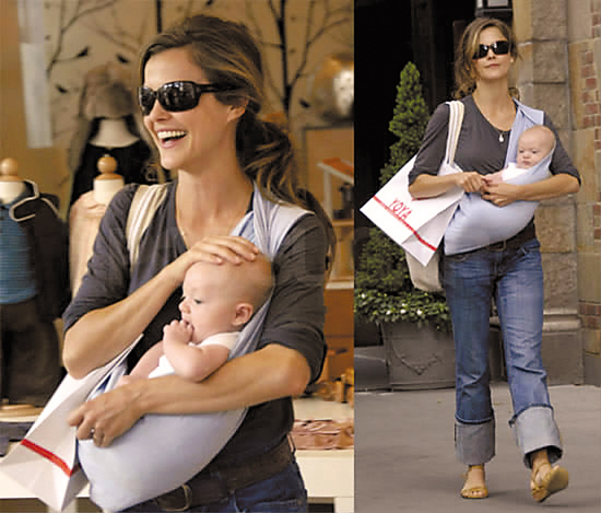 好有想象力哦,抱小孩还可以这么有型。妈妈身上的灰蓝色和宝宝抱袋的天蓝色相映成趣。