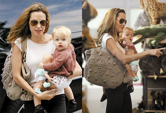 一身棉T恤外加米色针织包极具亲和力,又不失时尚感。宝宝身上的深粉色就像朱莉脸上的胭脂,很提神。