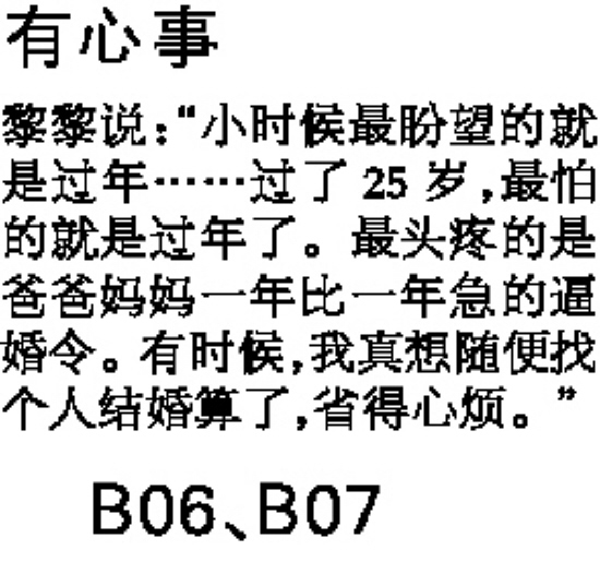 黎黎说:“小时候最盼望的就是过年……过了25岁,最怕的就是过年了。最头疼的是爸爸妈妈一年比一年急的逼婚令。有时候,我真想随便找个人结婚算了,省得心烦。”