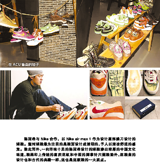 陈冠希与Nike合作,以Nike air max 1 作为设计原形操刀设计的球鞋。整对球鞋最为注目的是鞋面设计成透明的,予人以清凉舒适的感觉。除此而外,一向洋味十足的陈冠希设计的球鞋渗出浓厚的中国文化味道,鞋跟印上传统的喜庆花纹和中医的脚掌针穴图鞋垫外,连鞋盒的设计也和古代的典籍一样,这也是这款鞋的一大卖点。