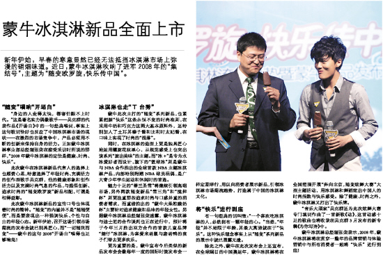 “身边的人走得太快,都害怕跟不上时代。”这是著名实力偶像歌手——吴克群的代表作品《开场白》中的一句经典唱词,事实上这句歌词恰好也反应了中国冰淇淋市场的现状——在激烈的市场竞争中,产品必须用不断的创新来保持自身的活力。正如蒙牛冰淇淋事业部总经理张荣在接受采访时所说的那样,“2008年蒙牛冰淇淋的定位是健康、时尚、快乐”。