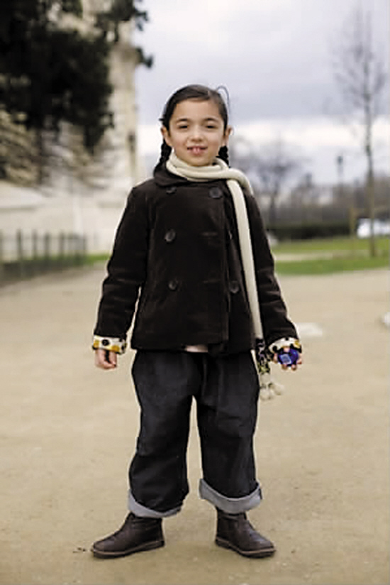 3小麻花辫,双排扣和阔腿裤,鞋子的颜色跟衣服搭配,这个小姑娘肯定有个很会穿衣服的妈妈。