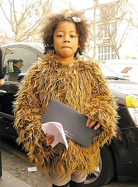 4小贵妇,十足的小贵妇。泥土色的皮草大衣跟她的肤色非常协调,发型也很可爱。手上拿的应该是张邀请函吧。