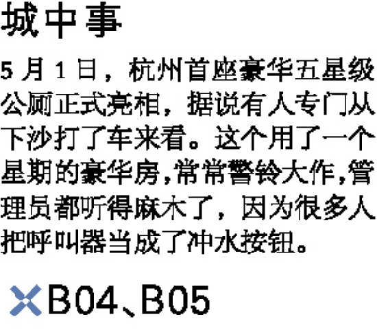 5月1日,杭州首座豪华五星级公厕正式亮相,据说有人专门从下沙打了车来看。这个用了一个星期的豪华房,常常警铃大作,管理员都听得麻木了,因为很多人把呼叫器当成了冲水按钮。