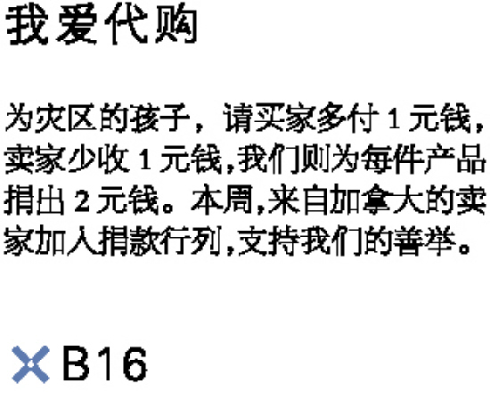 为灾区的孩子,请买家多付1元钱,卖家少收1元钱,我们则为每件产品捐出2元钱。本周,来自加拿大的卖家加入捐款行列,支持我们的善举。
