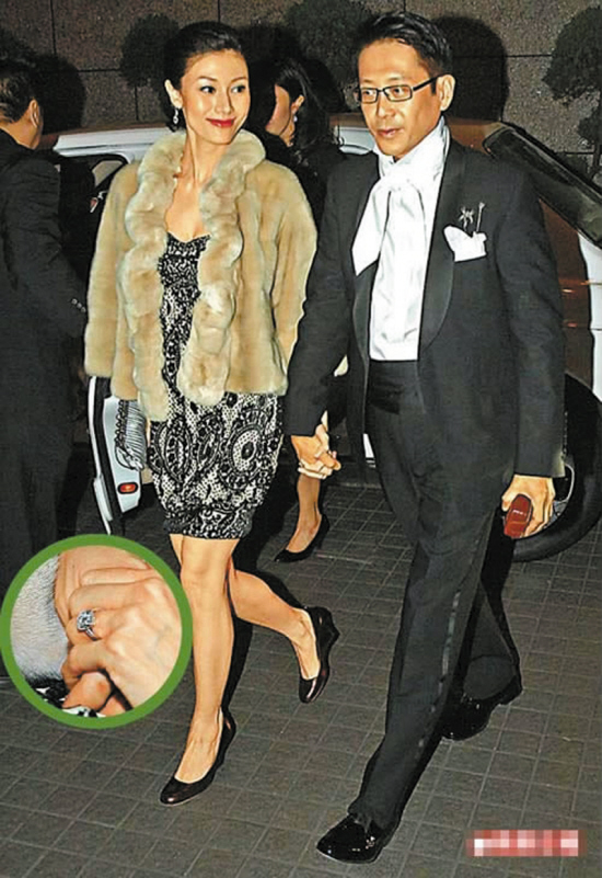 白底暗花的低小礼服,搭一件米色小皮草。性感而优雅,加上比什么都美的幸福笑容,请注意李美人的手,这么大的钻石戒指和皮草一起营造雍容华贵的效果,李美人果然笑得灿烂。