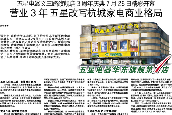 3年来,五星电器文三路旗舰店对文三周边、对城西乃至对整个杭州都产生了强大的辐射力。毋庸置疑,五星电器文三华东第一店已经奠定了杭城西部数字商圈的霸主地位。