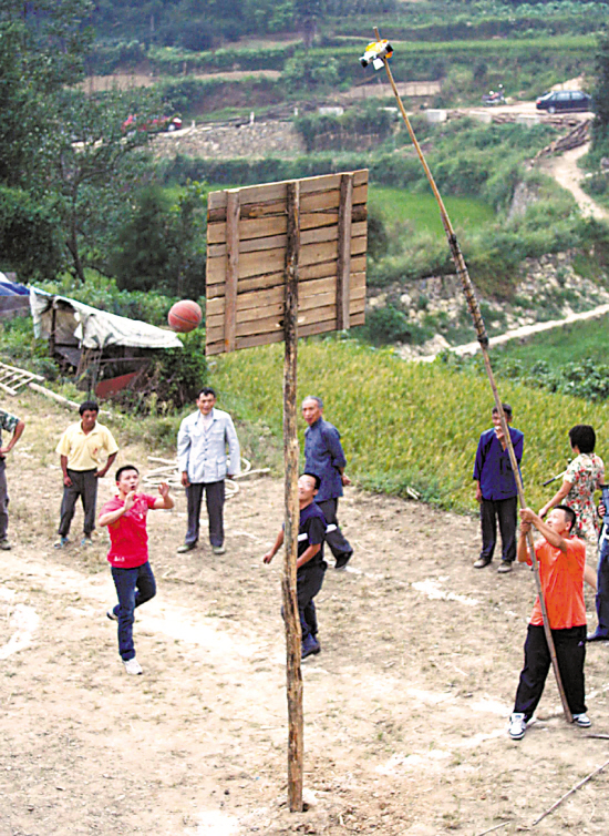 3.乡亲们在李高强做的篮球架下投篮