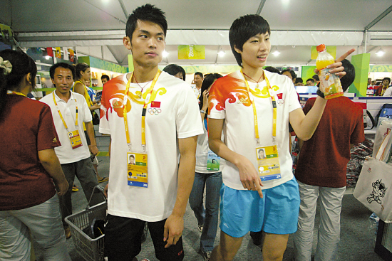 情侣档队员林丹、谢杏芳在奥运村纪念品商店购物。看来携手购物是我们的“超级丹”和羽毛球女王舒缓压力的必胜法宝。