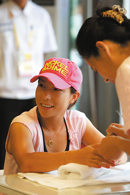 网球选手郑洁在北京奥运村的美容院做美甲。或许我们的网坛美女想用自己亮闪闪的指甲晃晕对手,轻松地在主场夺魁。