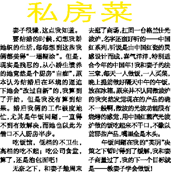 要结婚的时候,幻想我耕她织的生活,每每想到这些我俩都美得“一塌糊涂”。但是,现实是残忍的,从小娇生惯养的她竟然是个厨房“白痴”,原本认为结婚后在环境的逼迫下她会“改过自新”的,我算到了开始,但是我没有算到结果。婚后我俩的工作极度地忙,尤其是午饭问题,一直得不到有效解决,而她也以此为借口不入厨房半步。