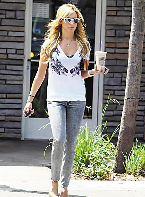 白色背心配一条灰色9分铅笔裤,非常生活化的搭配。黛尔用一件宝蓝色的裹胸让整套衣服显得很有看头。