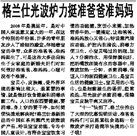 “十一”快到了,格兰仕推出了大型的优惠促销活动,准爸爸妈妈们可以抓紧机会选购一台微波炉来打造简单快捷的小日子哦!