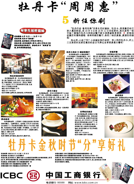 “牡丹行动 食尚先锋”尽享生活好滋味!牡丹卡,周周惠活动已进入最后阶段,在10月6日至10月11日活动期间,您只要凭一张中国工商银行牡丹卡到指定餐厅刷卡消费就能享受到 折特别优惠的专属待遇哦!各种风格的餐厅,各色口味的美食、美酒任你挑选!