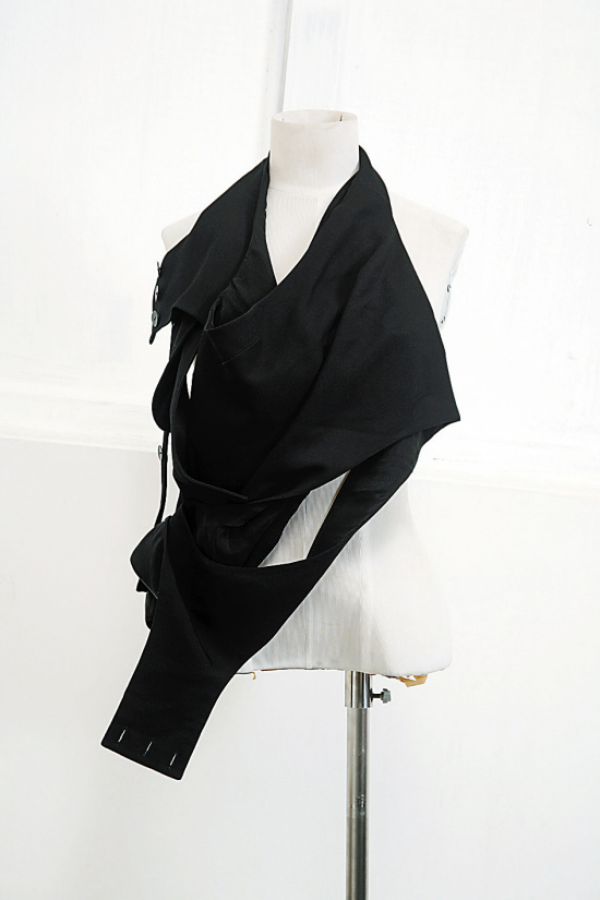 d/ 先把其中一边袖圈穿过头,再随意把其余部分披上,立刻变成超型围巾。