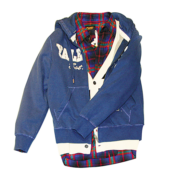 英伦格子衬衫,同色系的毛衣开衫再配宝蓝色拉链卫衣,很有层次感