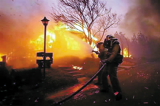 美国加州的大火摧毁100多栋明星豪宅。当地《洛杉矶时报》报道称,至当地时间15日傍晚,大火在洛杉矶和橙县已烧毁和损坏了600多间房屋,在被烧毁的房屋中包括许多名人豪宅,这些豪宅大多背山面海,价值连城。如知名脱口秀主持人奥普拉和好莱坞男影星迈克·道格拉斯等人在当地都拥有豪宅。据估计,仅在美国南加州洛杉矶富豪名人们聚居的滨海小镇蒙特塞图,大火至少烧毁了100多栋名人豪宅。
