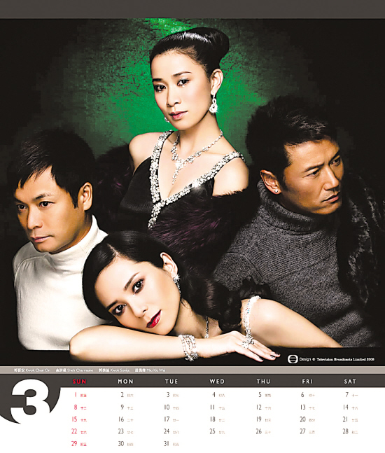 TVB公布了一组新年的艺人月历,特别邀请了星级化妆师ZING担任艺术总监,著名摄影大师PAUL TSANG负责摄影。这张3月份的月历,郭晋安、佘诗曼、郭羡妮、苗侨伟以冷艳高贵的造型亮相。