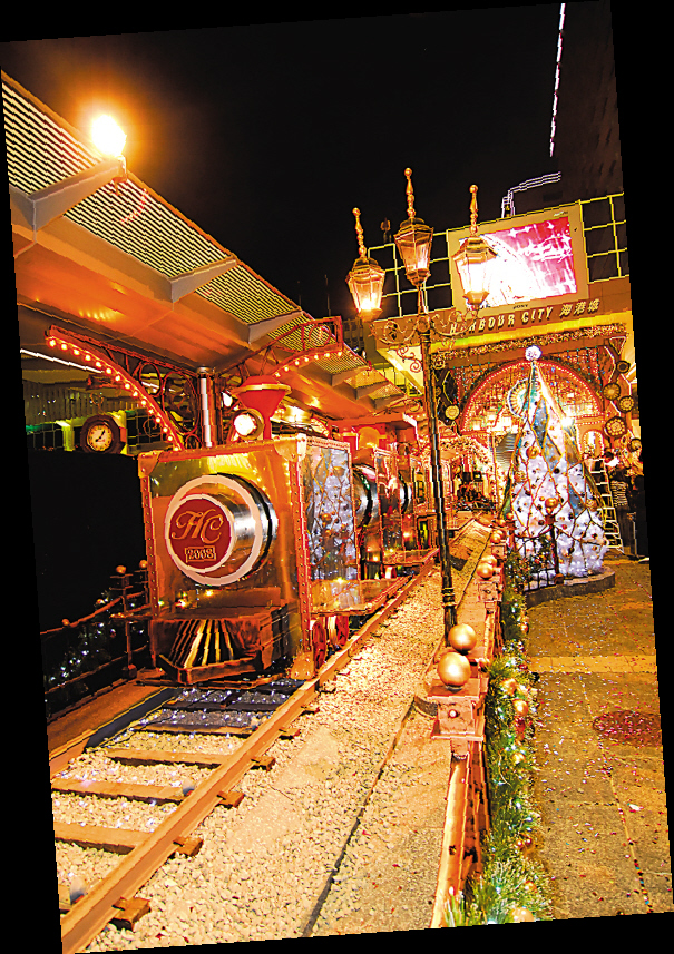 每年,香港都有一个令人瞩目的圣诞机动装饰,这次从海港城出发,以中世纪欧洲火车站为题。不过你第一眼不会看到火车,而是看到两个古典行李箱,当历时30秒左右的表演开始后,你就会看到行李箱如变形金刚般变身成小火车,正门用上逾万个LED灯泡,中央挂上古典报时大钟,两旁更挂了12个分别显示芬兰、巴黎、柏林等时间的时钟,车厢内则将冰天冻地的北极熊和白色圣诞树带来香港。
