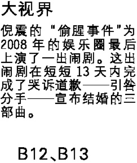 倪震的“偷腥事件”为2008年的娱乐圈最后上演了一出闹剧。这出闹剧在短短13天内完成了哭诉道歉——引咎分手——宣布结婚的三部曲。