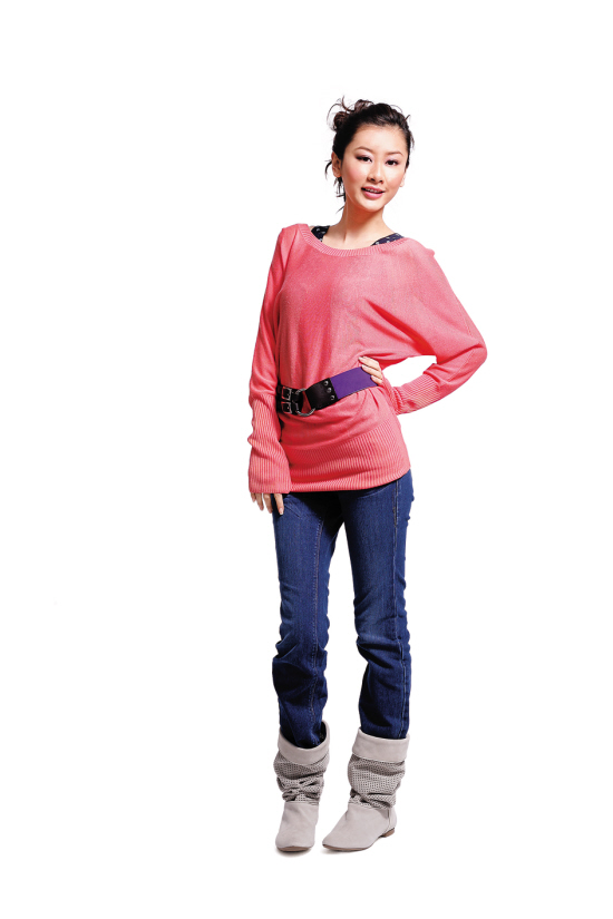 穿上宽松针织上衣时,最好配搭窄牛,感觉便不会累赘了。