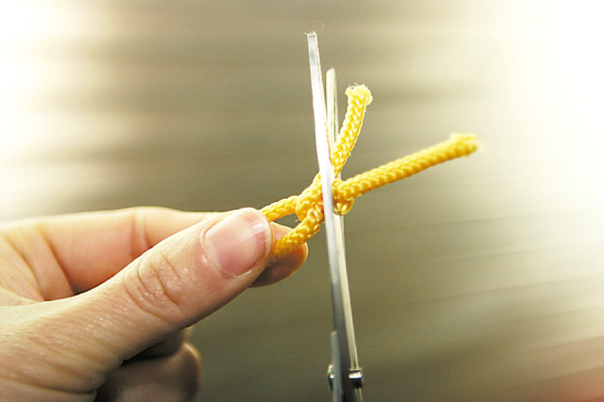 5.用剪刀将打好的结剪掉,对着打结处吹一口气。展开绳子,交给观众查看,发现绳子已经复原了, 没有任何剪断的痕迹。