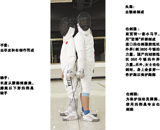 进口的击剑服能抵抗外界(剑)800牛顿的力量,国产的则能抵抗350牛顿的外界力量。另外,女士在击剑时,身上会多穿一件护胸以保护胸部