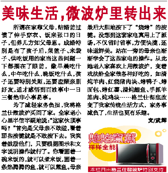 为了减轻家务负担,我将格兰仕微波炉买回了家。全家老小心里半信半疑地说:“这家伙顶事吗?”首先是父母亲不敢碰,看着那些按键就是不敢按下去。我笑着鼓励他们,只要根据图示和文字说明操作就行了。你看画着一碗米饭的,就可以煮米饭,画着一条热腾腾的鱼,就可以蒸鱼。母亲最后大胆地按下了“烧烤”的按键。没想到这套家电真用上了派场,不仅省时省事,方便快捷,还味道鲜美。站在一旁的母亲也渐渐学会了这些家电的操作。从此她老人家喜欢上用微波炉,变着戏法给全家做各种好吃的,如清炖羊肉、红烧猪肉块、烤鸭子、烤面包、烤红薯、清炖鲤鱼、手抓羊羔肉、炖鸡块……格兰仕彻底改变了我家传统生活方式,家务事减负了,生活也更有乐趣。