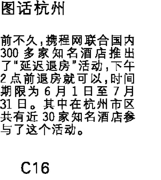 前不久,携程网联合国内300多家知名酒店推出了“延迟退房”活动,下午2点前退房就可以,时间期限为6月1日至7月31日。其中在杭州市区共有近30家知名酒店参与了这个活动。